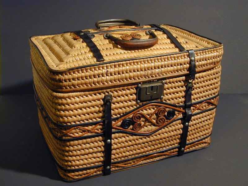 Ce panier dont les dimensions sont H. 35 - L. 45 - L. 33 cm, est en osier tressé avec les motifs décoratifs en osier teinté noir et marron.