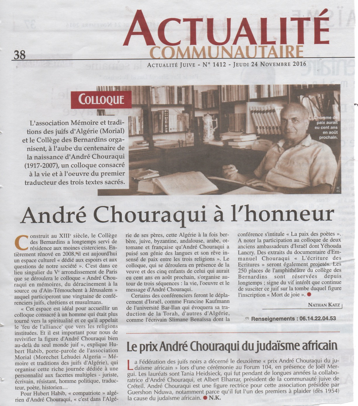 On parle de nous sur : "Actualité Juive" N°1412 du jeudi 24 novembre 2016, page 38.