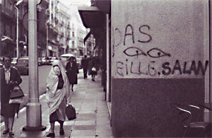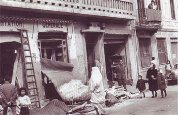 Plastiquage d’un magasin…le quotidien L’heure était à la prudence à la discrétion et à la méfiance depuis plusieurs mois. L’OAS interdisait à présent la pénétration de Bab el Oued à toute personne dès lors qu’elle avait le type maghrébin, c’est-à-dire à tout arabe quel qu’il fut. Je revois encore ce pauvre vieillard à chéchia, cible trop facile, abattu à la nuit tombante, avenue de la Marne, la tête éclatée se vidant de son sang dans le caniveau, et ces oranges s’échappant sur la chaussée du petit couffin dans lequel il les transportait, lentement, une à une…