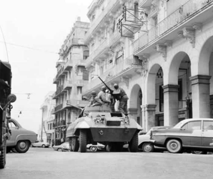 Deux patrouilles de soldats casqués (garde-mobiles, soldats du contingent ?) armés de MAT49 , chargeurs engagés donc prêts à ouvrir le feu, progressaient lentement en remontant l’avenue sur chacun des trottoirs, longeant les murs, prudemment, leurs regards tournés vers les balcons.