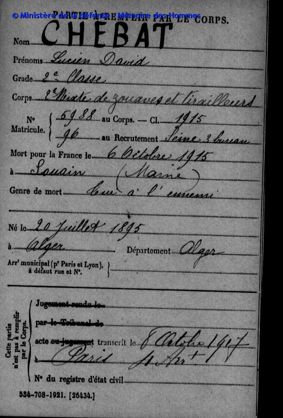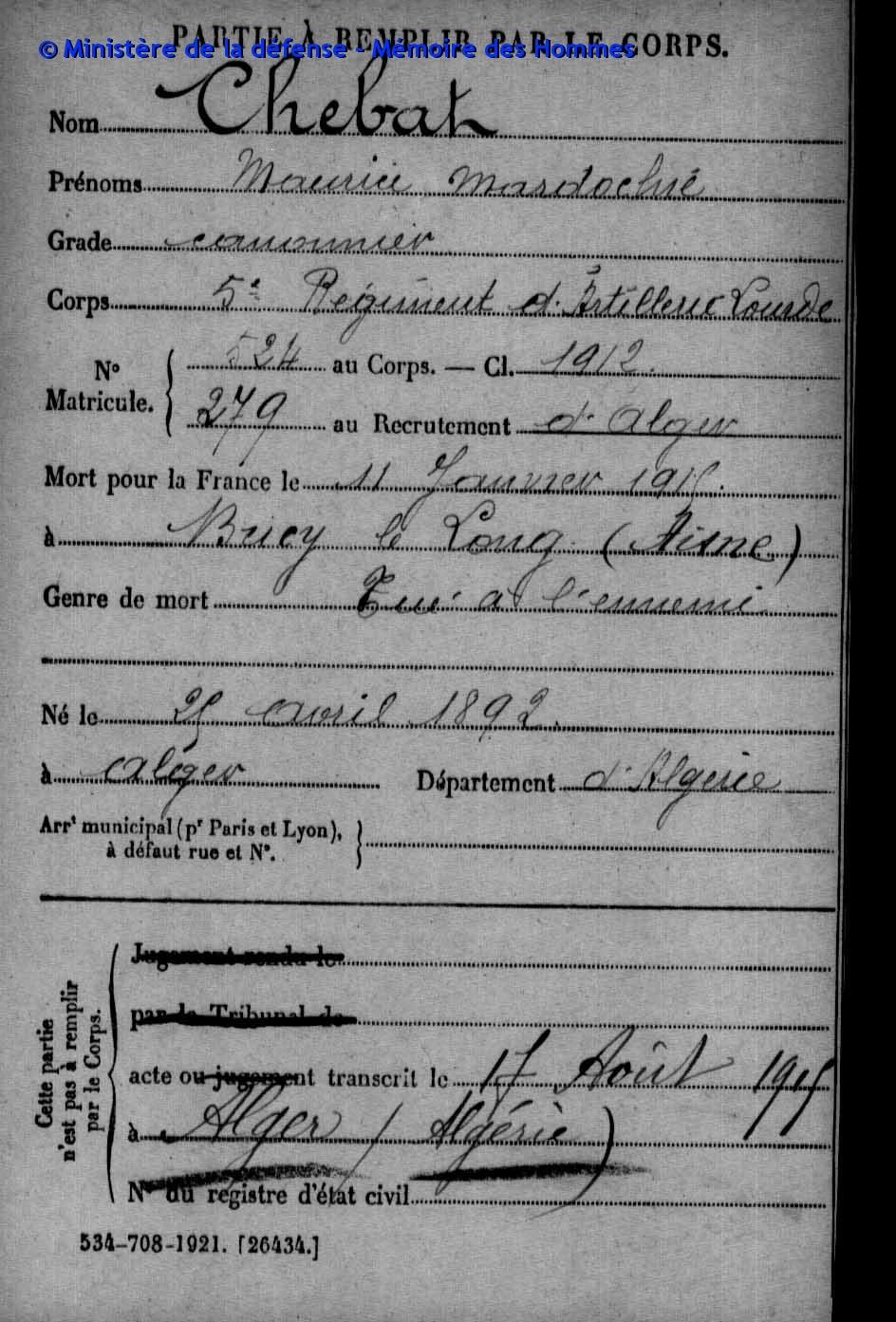 Né le 20/07/1895 à Alger - Mort pour la France le 6/10/1915