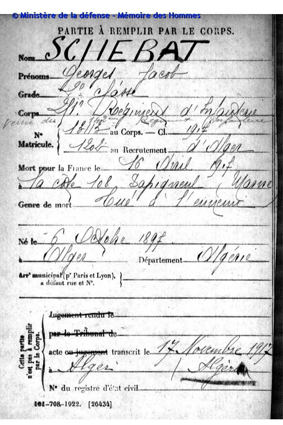 Né à Alger le 6/10/1897 - Mort pour la France le  16/04/1917)