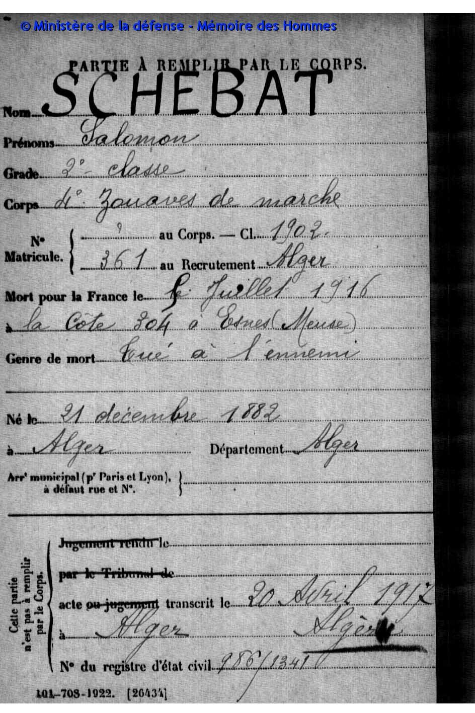- Charles-Shalom Chebat : gazé en 1917. Il est mort en 1919, laissant une veuve de 28 ans, Esther Benisti et deux orphelins de six et trois ans, Robert-Isaac (père de Jean-Charles/Shlomo Chebat) et son frère Daniel-Claude.