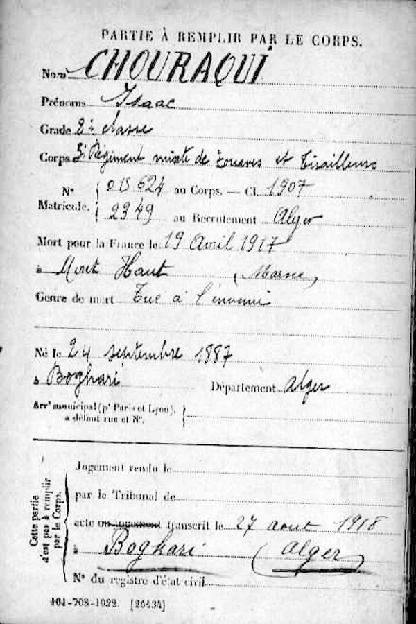 Isaac est "Mort pour la France" le 19 avril 1917, à Mont-Haut dans le département de la Marne.