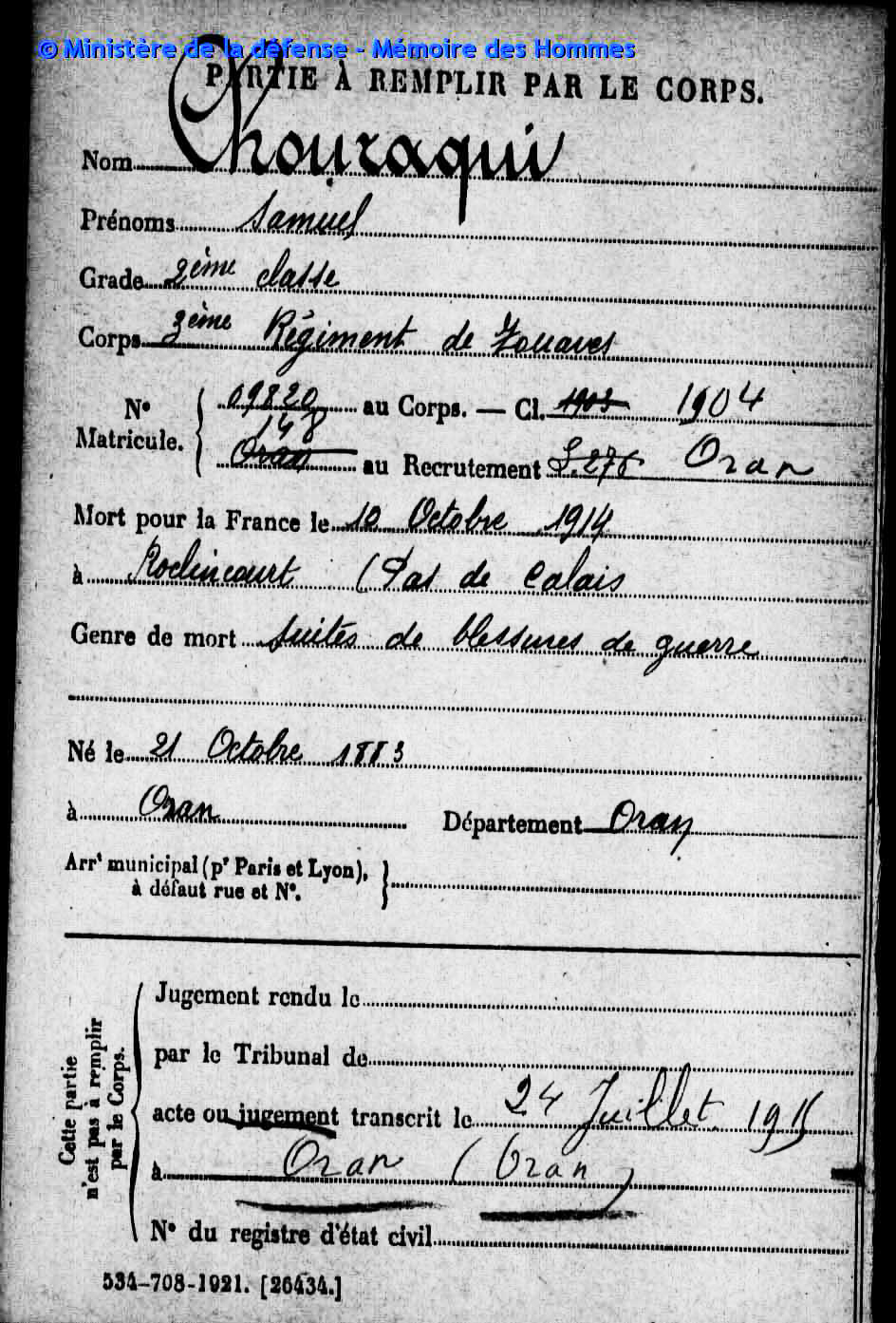 Samuel Chouraqui, est décédé le 10 Octobre 1914 à Roclincourt dans le département du Pas-de-Calais