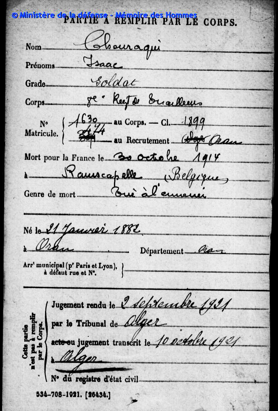 Isaac Chouraqui (mon arrière grand-père paternel) est décédé le 30 Octobre 1914 à Ramscapelle en Belgique