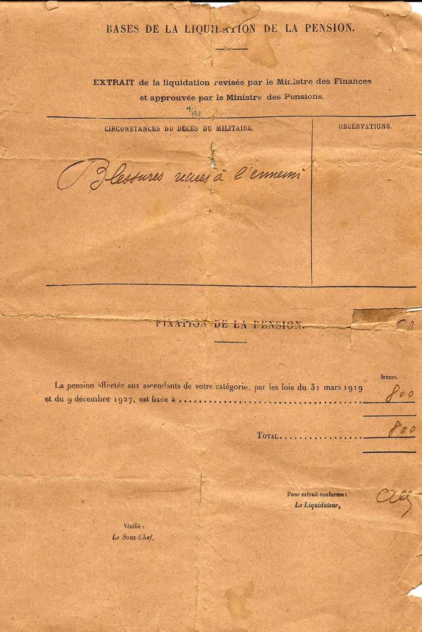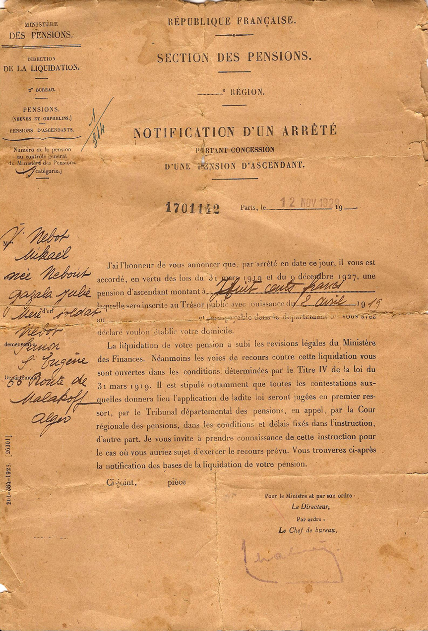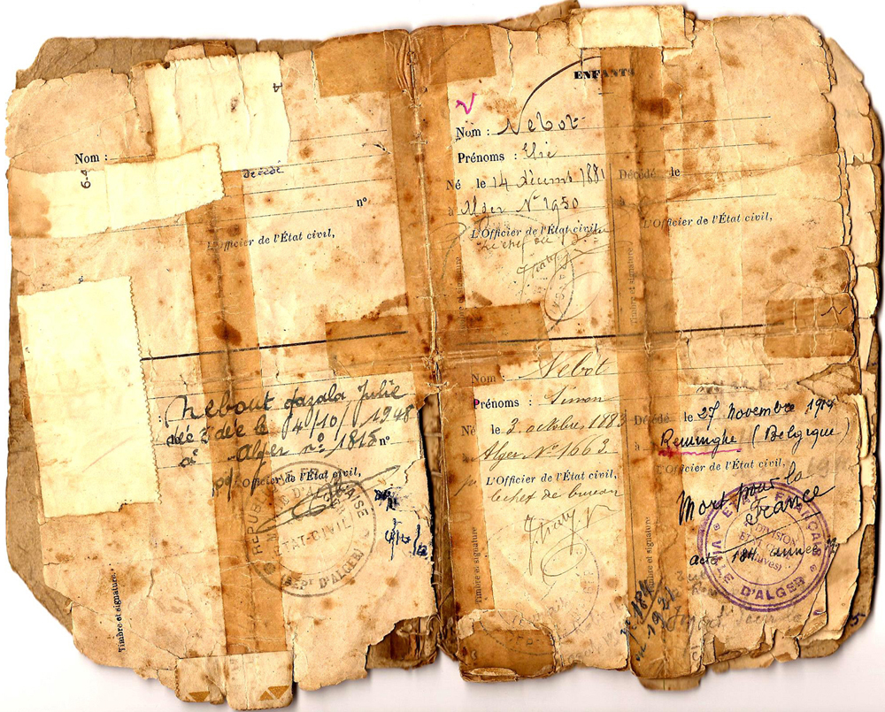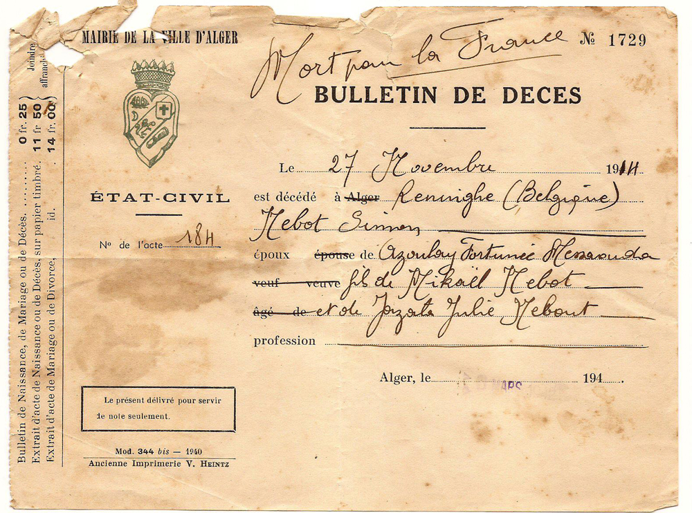 Il me les envoya par la poste et qu’elle ne fut pas ma surprise de recevoir le livret de famille de mon arrière grand père et le bulletin de décès, avec l’inscription : "Mort pour la France" de ce Simon Nebot dont j’avais appris l’existence si peu de temps auparavant.