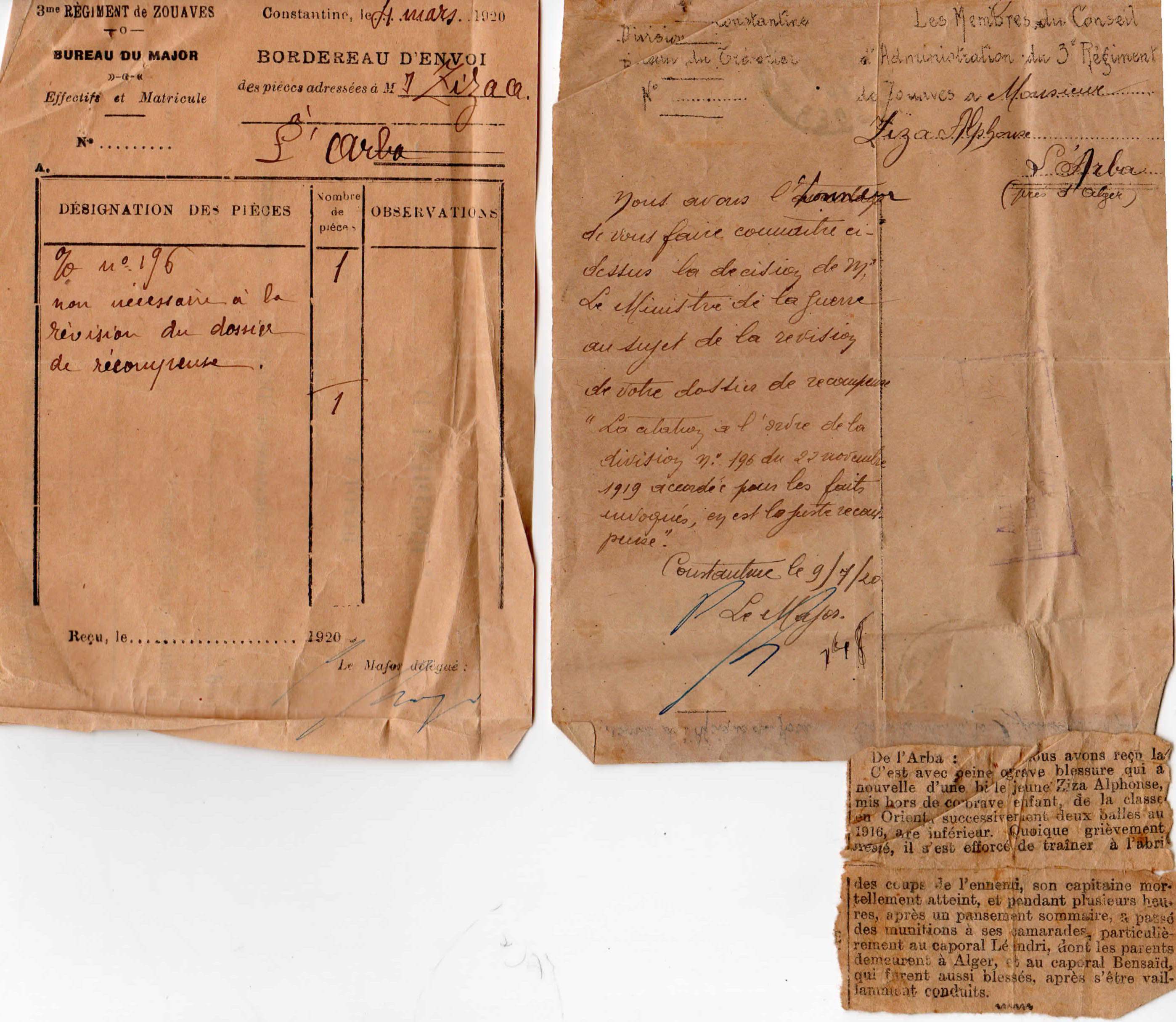 Bordereau d’envoi de juillet 1920 du dossier d’une citation à une récompense