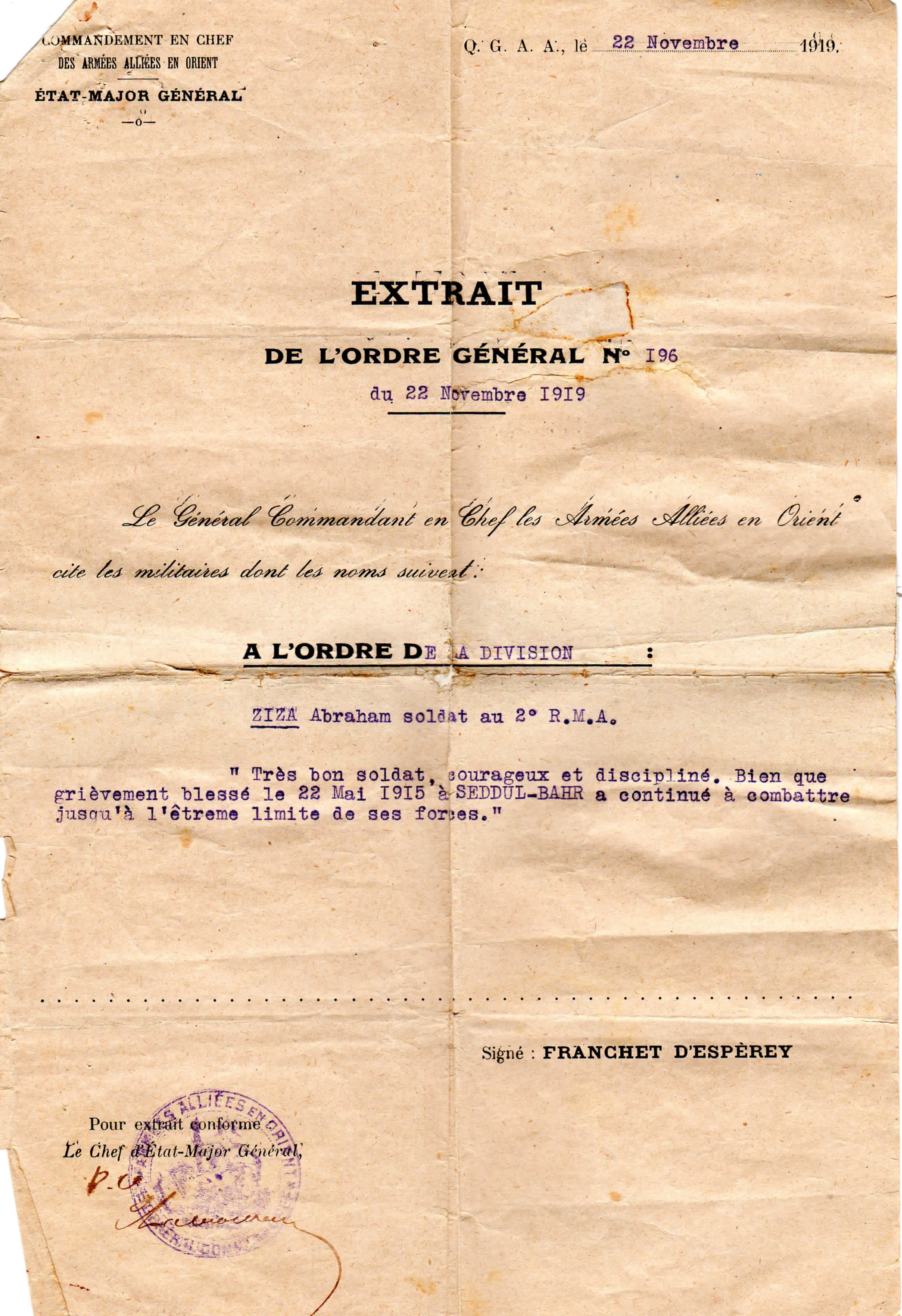 Sur l’extrait de l’Ordre Général du 22 novembre 1919, signé par le général Franchet d’Espérey, Commandant en Chef les Armées Alliées en Orient, il est mentionné : "Très bon soldat, courageux et discipliné, bien que grièvement blessé le 22 mai 1915 à Seddul-Bahr (bataille des Dardanelles) il a continué à combattre jusqu’à l’extrême limite de ses forces".