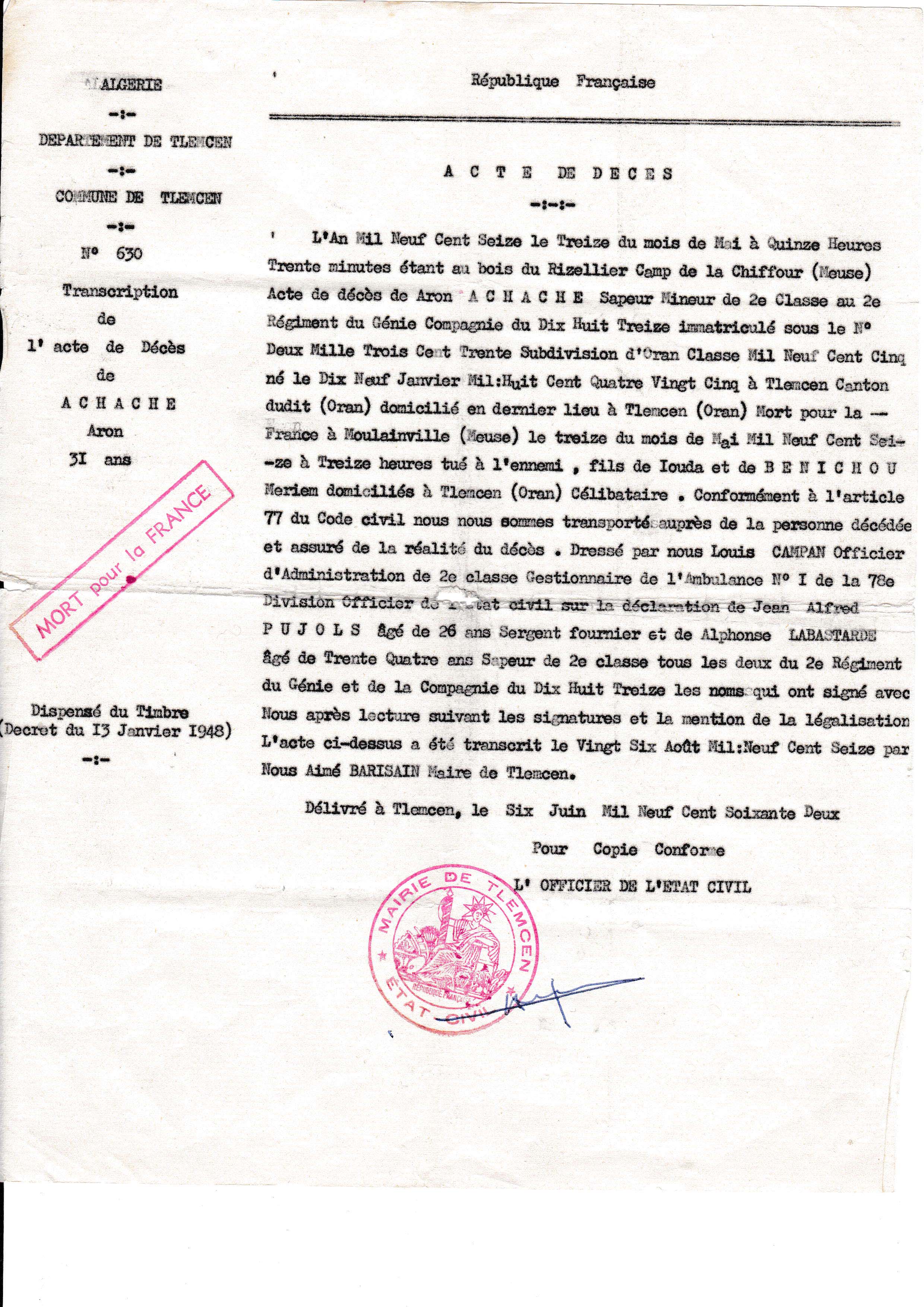 Aron Achache (Il est né le 19 janvier 1885 à Tlemcen – Il est "Mort pour la France" le 13 mars 1916 à Moulainville, dans la Meuse)